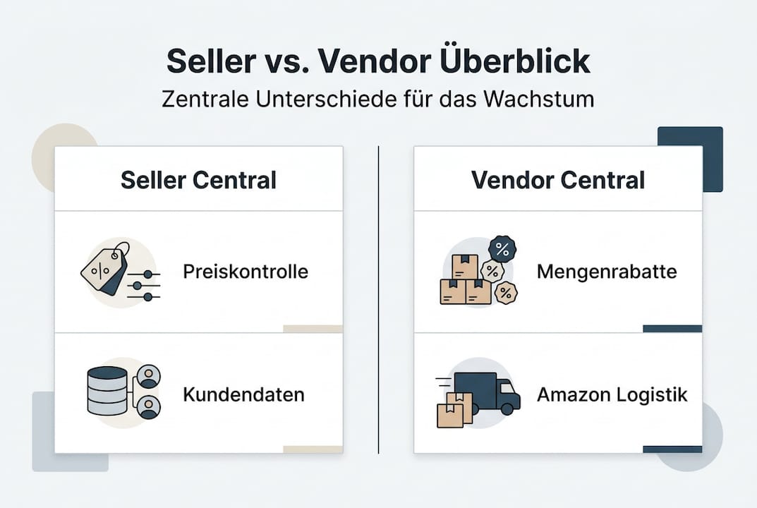 Seller Central steht für direkten Endkundenverkauf mit voller Kontrolle über Preis und Daten, während Vendor Central ein Großhandelsmodell ist, bei dem Amazon als Käufer auftritt und die Preishoheit übernimmt.