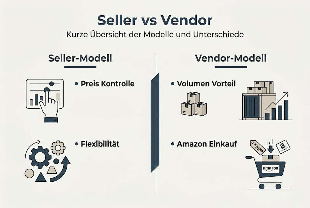 Seller verkaufen direkt an Endkunden mit voller Preis- und Marketingkontrolle, tragen aber Inventarrisiko. Vendor verkaufen an Amazon als Großhändler, erhalten planbare Zahlungen, haben aber geringere Margen und weniger Kontrolle. Seller eignet sich für die meisten Markeninhaber besser.